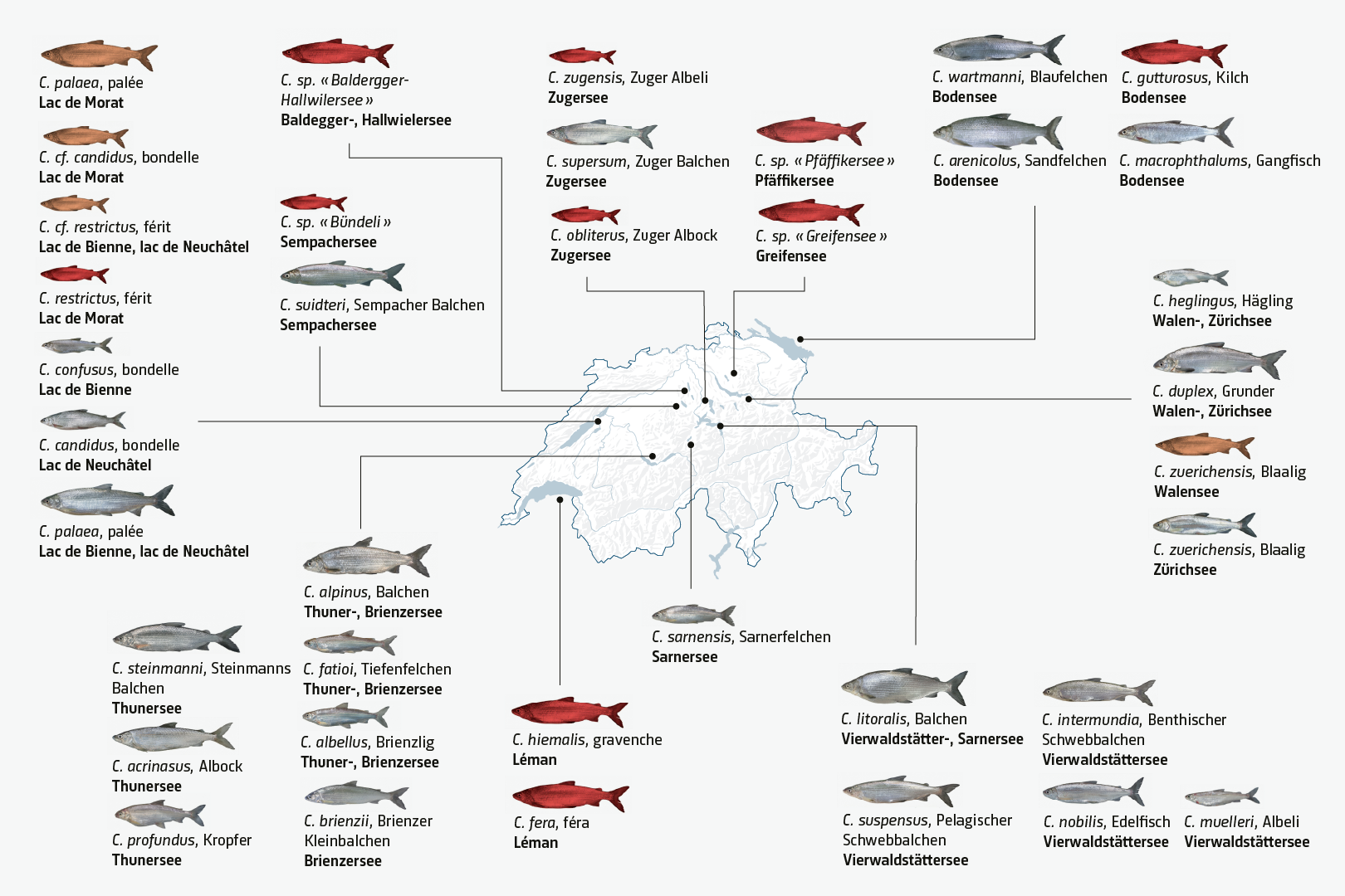63. Selz OM, Vonlanthen P, Kreienbühl T, Seehausen O (2025) Die aussergewöhnliche Vielfalt der Felchen der Schweiz – Ergebnisse aus 150 Jahren Forschung. Eawag/Aquabios GmbH. Auftraggeber: Bundesamt für Umwelt.